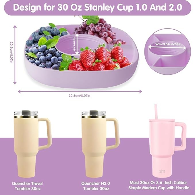 • 【Snack Tray for 30 oz Stanley Cup】The snack tray is specially designed for Stanley 30 oz tumbler with handles, fits both 1.0 and 2.0 cups.If you want to apply it to other simple modern cup with handles, please measure the diameter of the cup before purchasing.