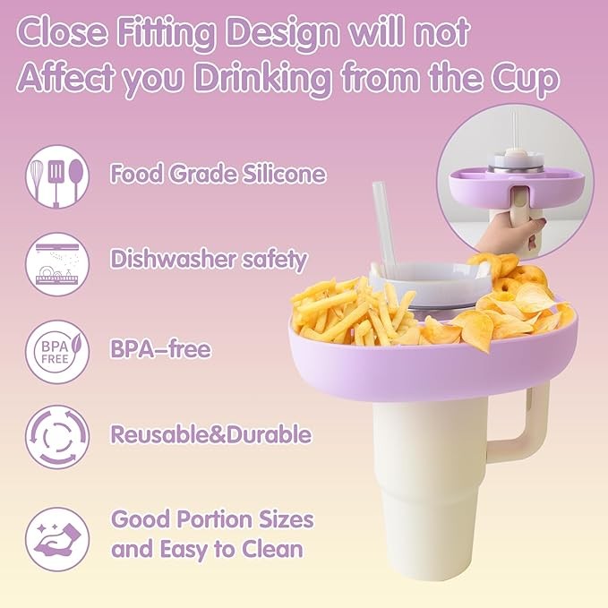 Snack Bowl for Stanley Cup 30 oz Tumbler with Handle,Portable Snack Tray for Stanley Cup,Reusable Stanley Cup Accessories Purple Silicone Snack Holder with 3 Compartments