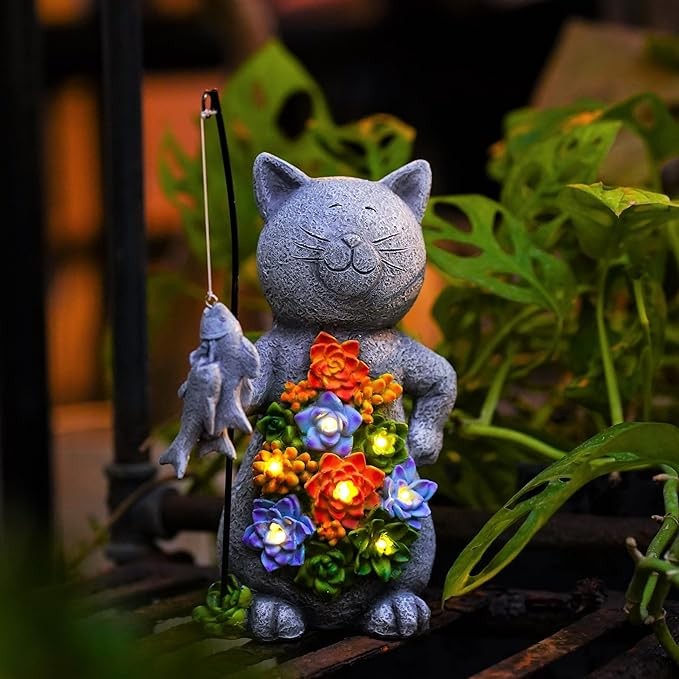 【Be different from others】Our cat statue has a fishing look, and the flowers on the cat will glow at night, adding a beautiful shape to your garden and making your yard even more attractive