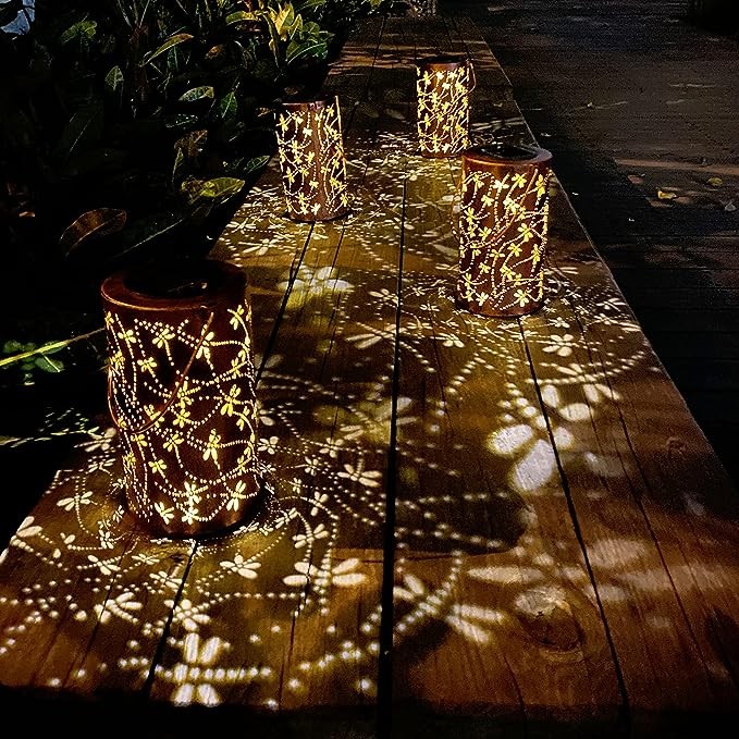 Gorgeous & imaginative Garden Decor - Fusion the retro gold, copper of exteriors and irregular pattern inside, at darkness, the solar lantern casting a bright, warm light with dragonfly pattern, which looks like a dragonfly flying symbolizes change.