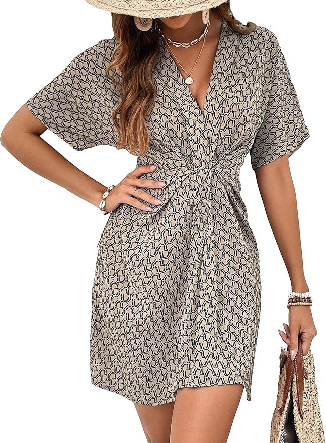 • Feature: all over print, twist, v neck, a line, high waist, short sleeve, flared hem, fashion short dresses for women