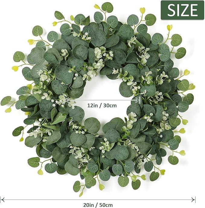 • 【Material】--- Artificial Green Eucalyptus Wreath are made of high-quality plastic and silk materials. Lifelike, never wilt and no maintenance require, it looks green, fresh and full of vitality all year around.