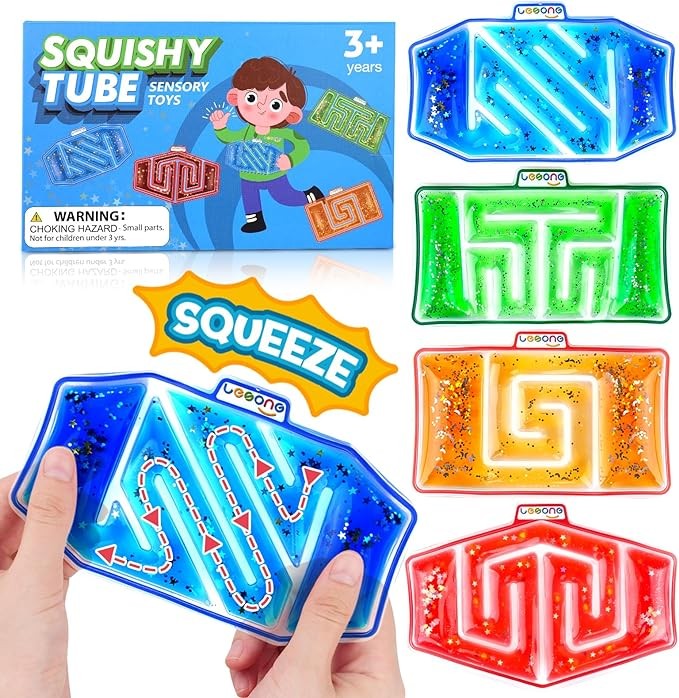 【4 Pack Squishy Fidget Sensory Toys】Squishy sensory toys not only have a twisted maze-like design, but they are also filled with a one-of-a-kind mixture of goo, glitter, and beads that rush and gush back and forth with every squeeze.Our adorable kids sensory toy showcases a mesmerizing flow of liquid accompanied by the delightful "sasa" sound of colliding beads.