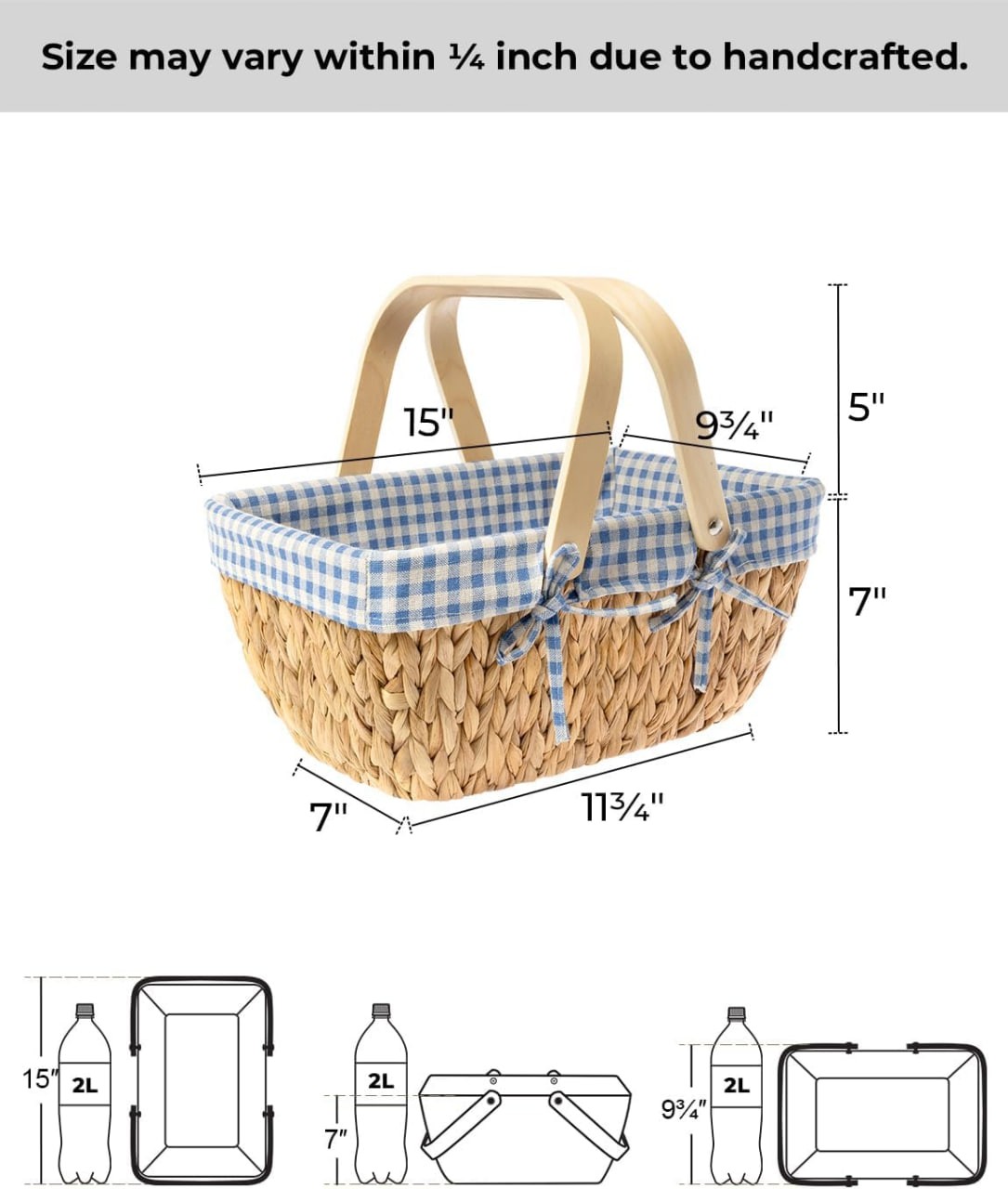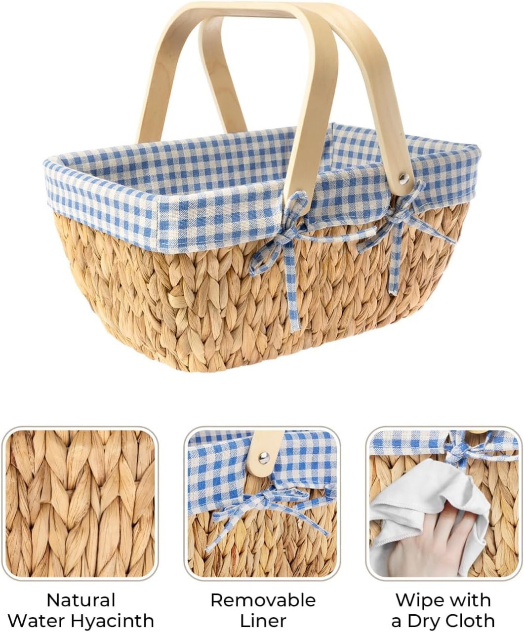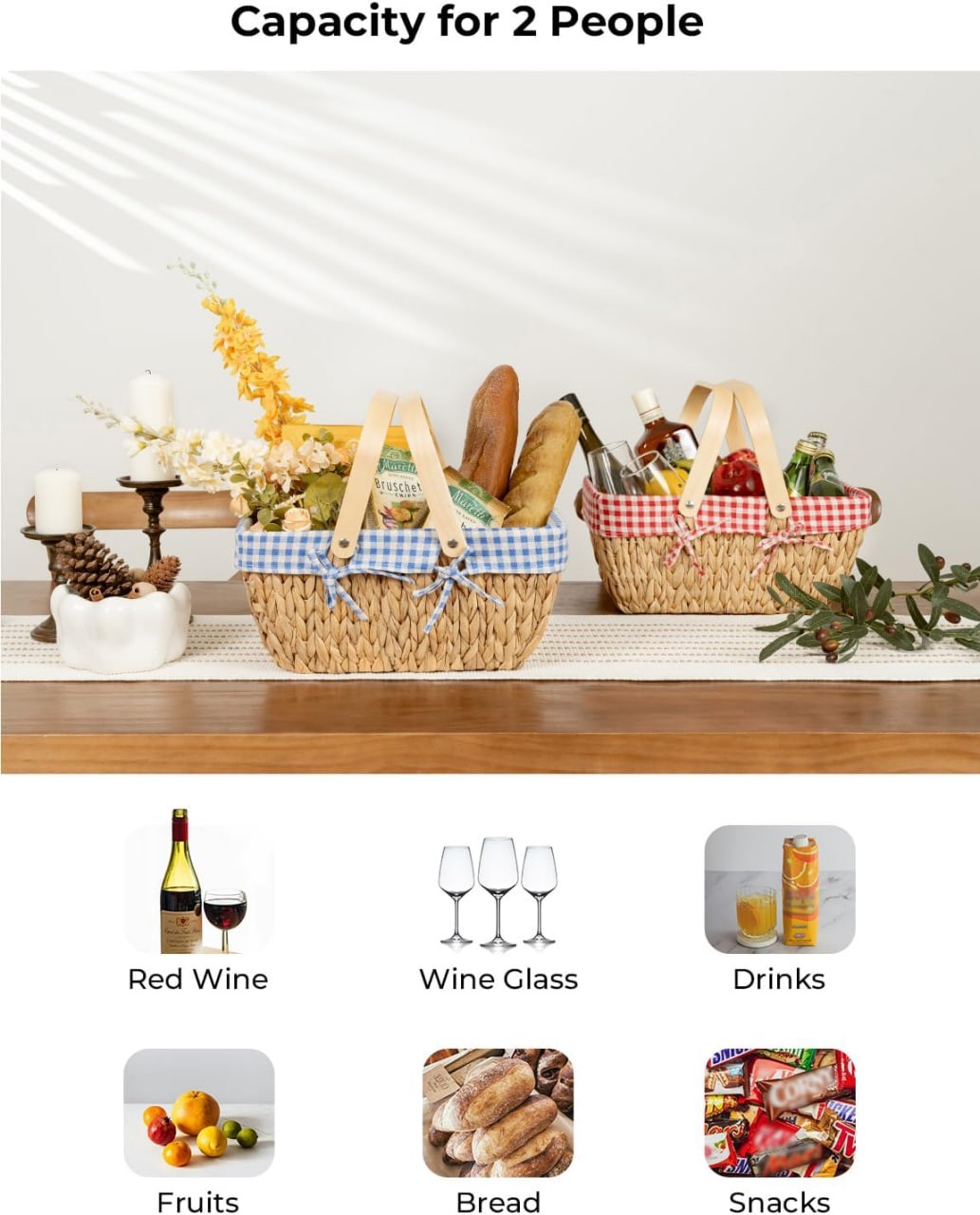 StorageWorks Wicker Picnic Basket for Couple, Picnic Basket with Wooden Handle and Washable Liner, Handwoven Natural Water Hyacinth Picnic Hamper for Camping, Outdoor, Christmas, Thanks Giving