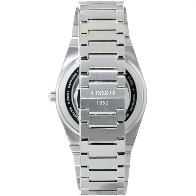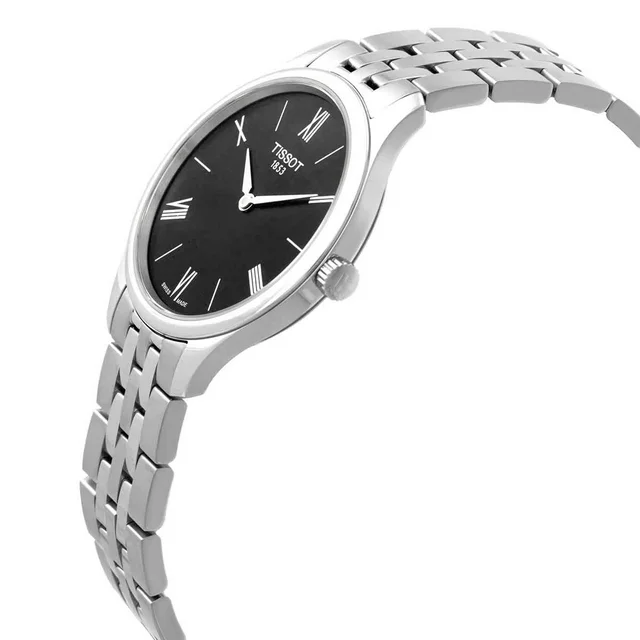 Black dial enhanced by silver-tone alpha-style hands. Silver-tone 316l stainless steel case with a silver-tone 316l stainless steel band. Quartz movement. 30 meters / 100 feet water resistance. Fixed bezel. Scratch Resistant Sapphire crystal. Solid caseback. Butterfly clasp. Pull / Push crown. Case size 31 mm x 5.15 mm. Band 14 mm x long. Tissot T063.209.11.058.00 Tradition 5.5 Watch.