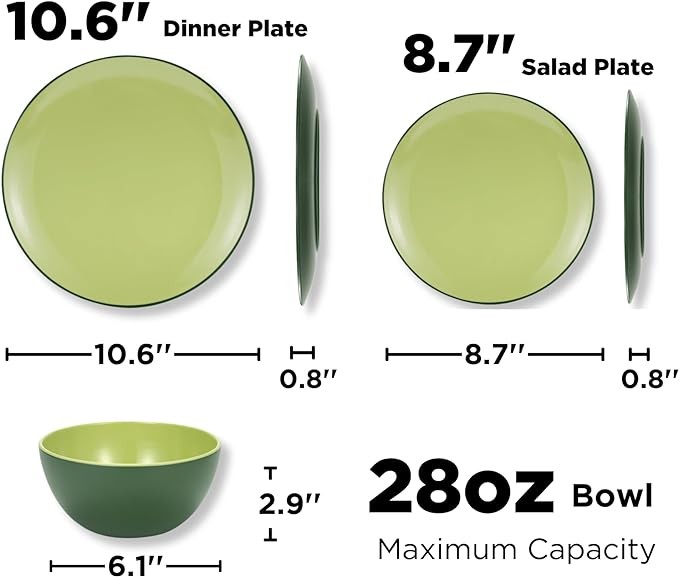 • Dinner Service for 4: TP creative and healthy avocado green dishes set with brilliant glow, includes 4 of each - 28 oz bowls, 10.6’’ dinner plates, 8.7” salad/dessert plates.