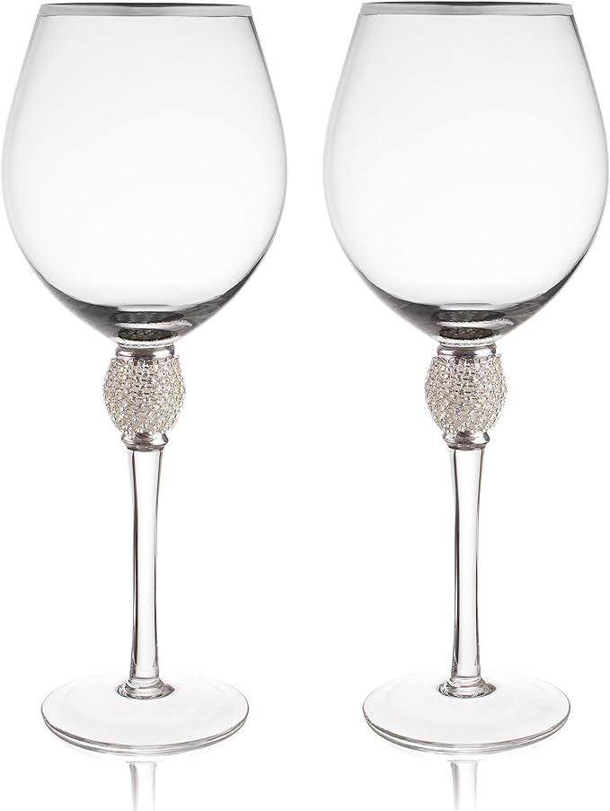 Trinkware Set of 2 Wine Glasses - Rhinestone DIAMOND Studded With Silver Rim - Long Stem, 16oz, 10-inches Tall – Elegant Glassware And Stemware