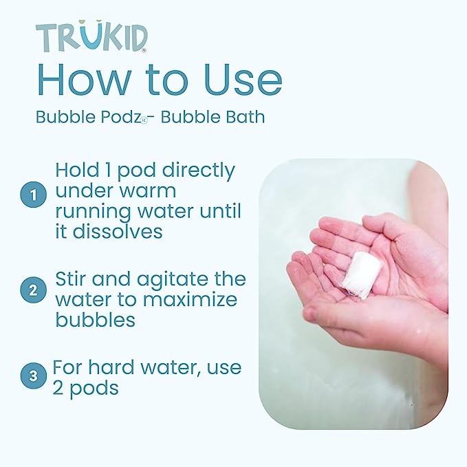 • Bubble Podz – Bubble Bath - Let your children splish and splash in a foamy, natural bubble bath from TruKid! This gentle bath formula comes in an efficient pod form and is parent-designed for sensitive skin. No-Mess, single use pod makes bubble baths so easy.