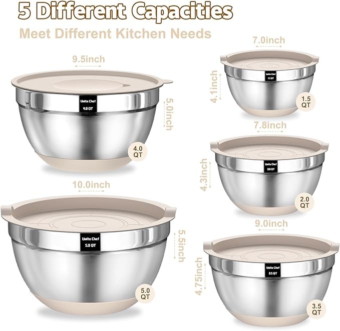 • AIRTIGHT BPA FREE LIDS & 5 SIZES BOWLS: The range of sizes from 5QT down to 1.5QT, makes this set incredibly versatile and suitable for a wide range of tasks. Each bowl comes with a QT label to make it easier to choose the right size. The airtight lids that come with this mixing bowl set make it easy to store ingredients and leftovers to Keep your food fresh for longer without worrying about spills or leaks. Bowl sizes fit on standard-size refrigerator shelves and cabinets.