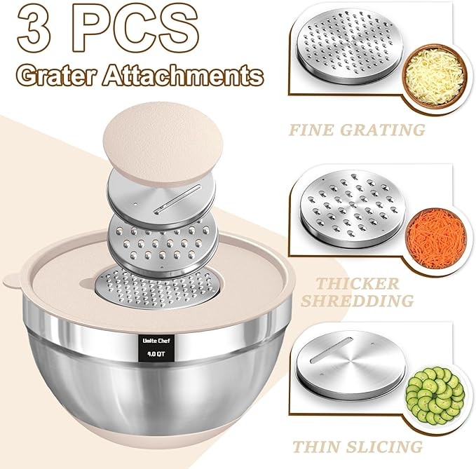 • 3GRATER ATTACHMENTS: This bowl set comes with 3 different grater attachments (slicing/grating/shredding) just shred or slice right into the bowl! without making a mess and eliminating the need for a cutting board to clean. 4qt had a removable lid inside the main lid, for adding contents or pairing it with your blender without removing the entire lid to prevent splash. For each cook enthusiast, this is a must in a kitchen! All necessary tools for cutting are very handy, easy to keep things clean around you