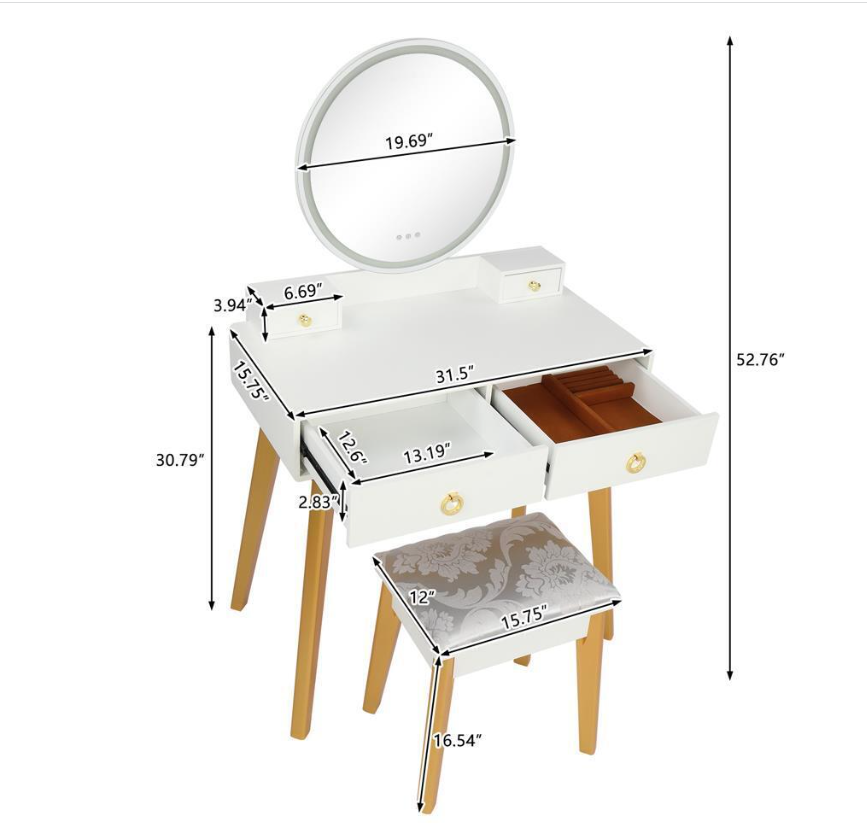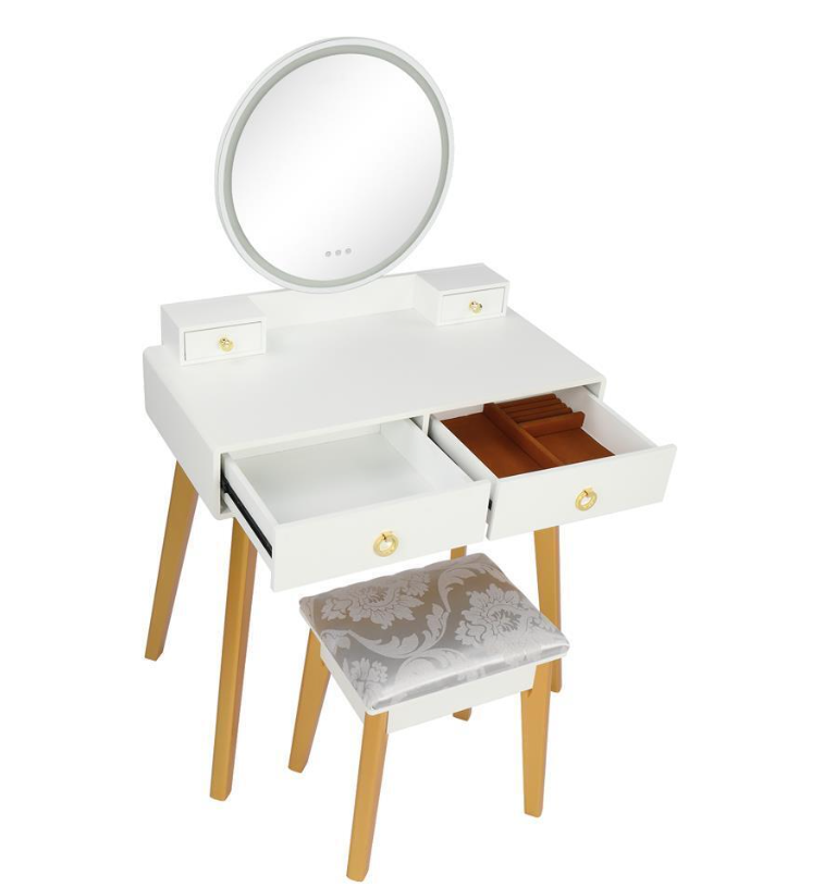 This is a very fashion, modern and simple dressing table. Adopting sturdy MDF and cylindrical solid wood leg support, the dressing table is full of modern sense. Large glass round mirror on the tabletop can show your beauty. Two small drawers and storage cases on the desktop can store your jewelry and cosmetics. Two drawers on the table with a panel can make a good classification for your cosmetics. When you are not using it, you can also remove it as a desk or other table. This dressing table can be placed in the living room, bedroom, or anywhere you want, which can provide the most beautiful furniture decoration for your home.