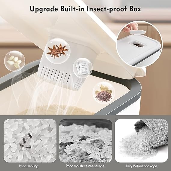 • 【Upgraded with Built-in Fresh Box】 The rice dispenser with a built-in fresh box, in order to keep your food safe from moisture and any pest, you can put some star anise, garlic, cloves, bay leaves, and desiccant in the proof fresh box of the rice storage container, so that you can enjoy natural fresh rice every day.