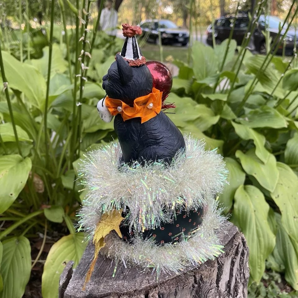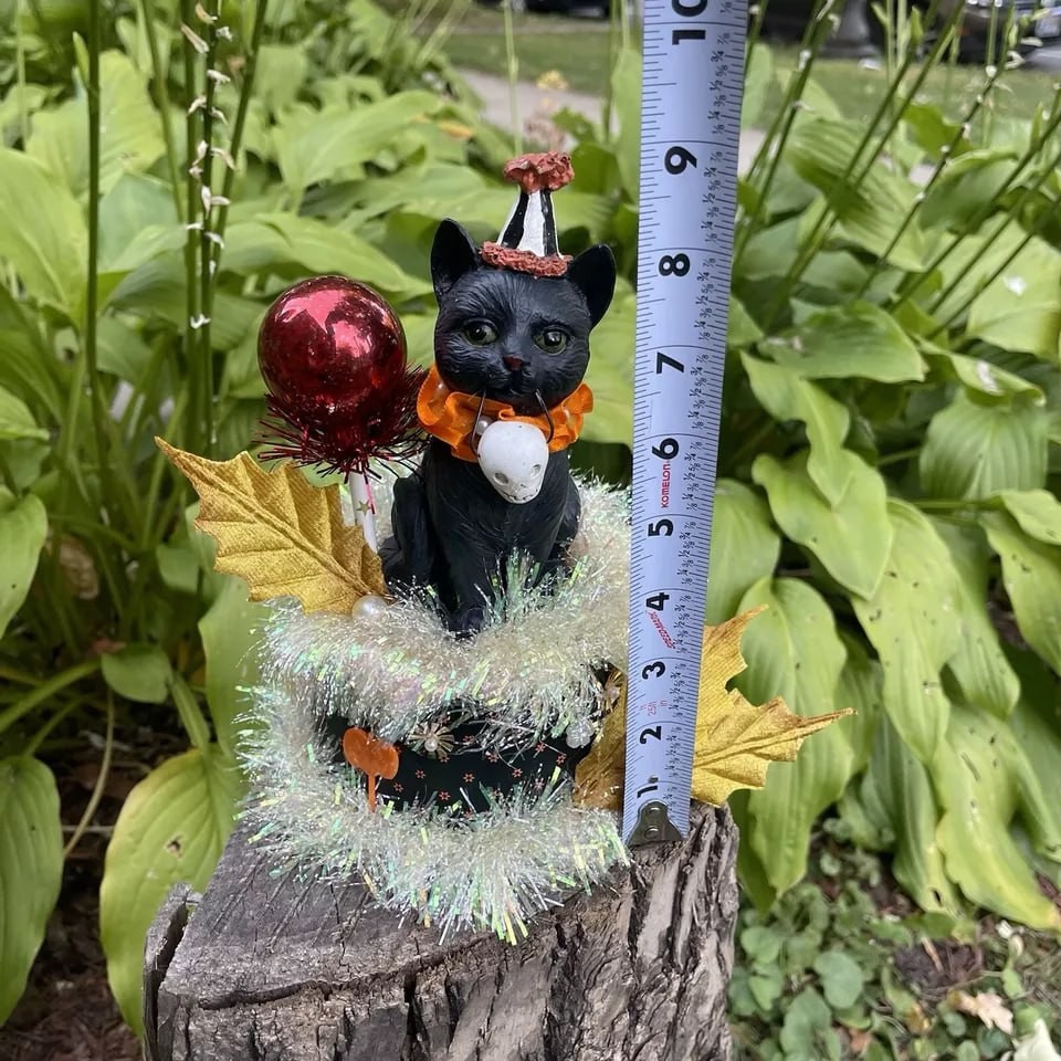 Hand made Halloween themed assemblage. Cute black cat holding a candy pail. About 9.5 in tall