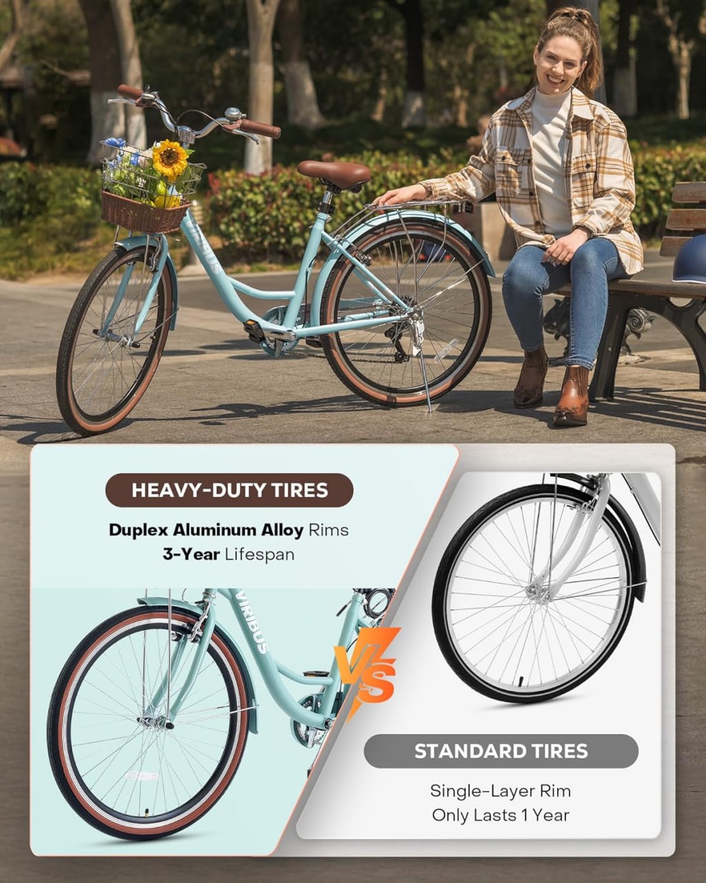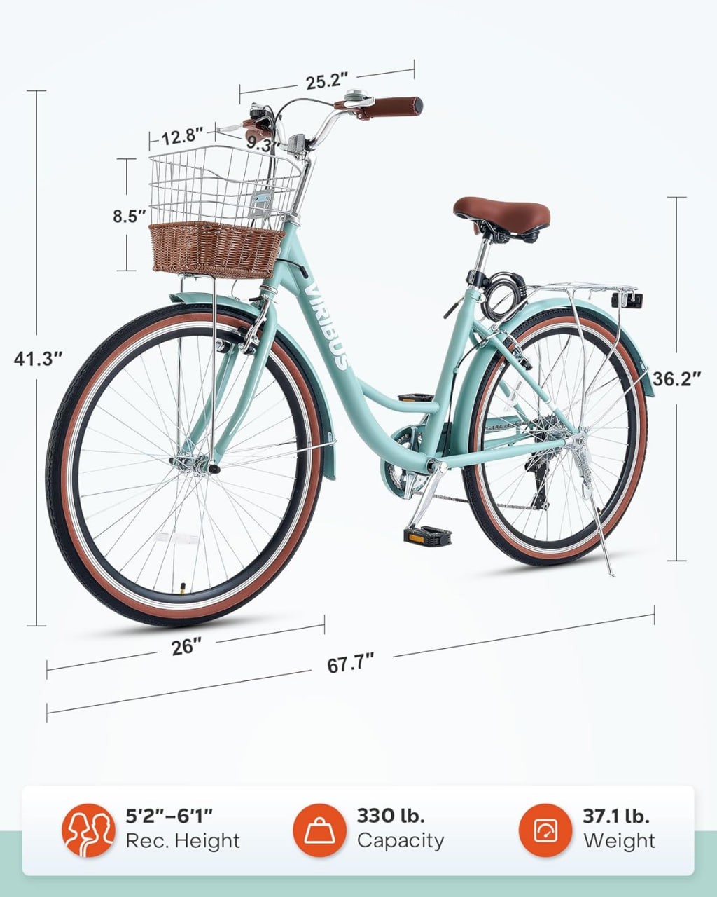Viribus Womens Bike, 7 Speed Bike for Adults Women 24 26 inch with Ratten Basket & Rack, Beach Cruiser Bike for Women, Womens Bicycle for Commuting, Step Through City Bikes for Women Adults Ladies