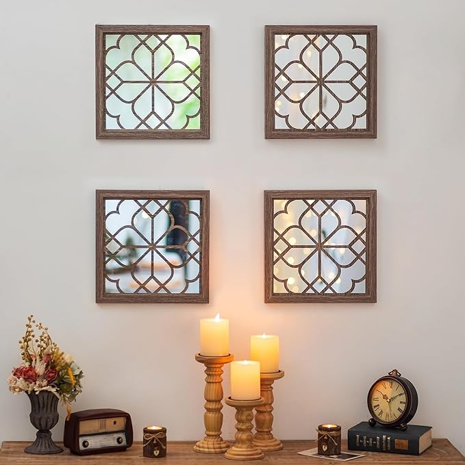 • Large or Small Wall Arts - Each framed wall art with mirror measures 12inch/30cm with 0.7inch/1.8cm thickness, more durable for a long time use. You can dress up small area with 1 or 2pcs of this rustic mirror wall decor, or combine the 4 pieces into a large wall mirror decor for living room.