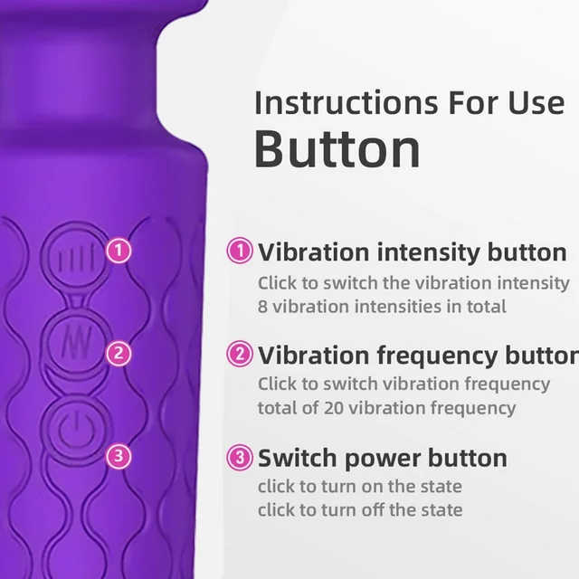 • The front end of the vibrator is slightly soft but firm enough to put pressure on body parts. The vibrator includes buttons for power, vibration intensity and vibration frequency settings. The multiple buttons offer a large number of different settings, so the user can choose what they like.