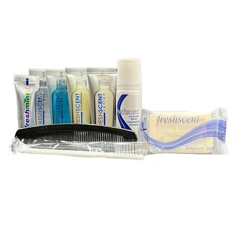 • DELUXE ITEMS - Each Travel kit contains a black comb, bottle of shampoo, conditioner, & body wash, face & body bar soap, a toothbrush and toothpaste, antipersperiant, and aloe-enriched hand & body lotion.