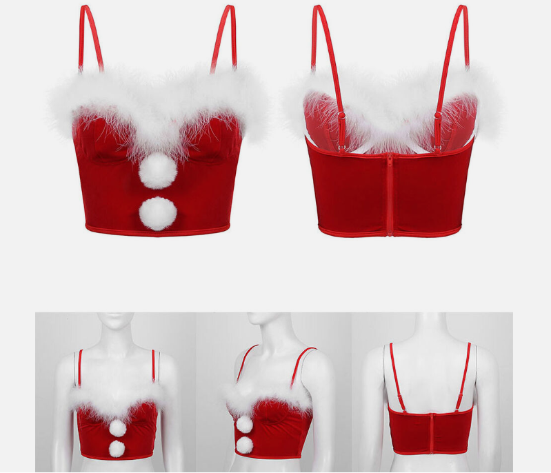 Underwired bra crop top with zipper on the back for easy wearing. Faux fur trimming and with two fuzzy balls on the front, looks cute and lovely.