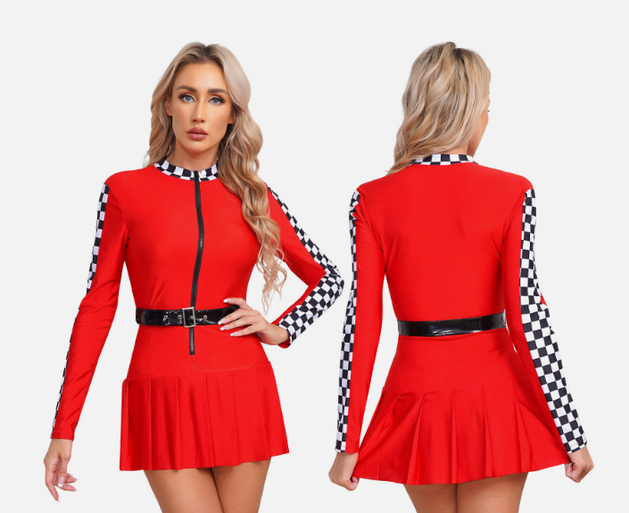 Checkerboard and belt make you a professional racing driver look, while pleated skirt adds a touch of cuteness, stylish and impressive.