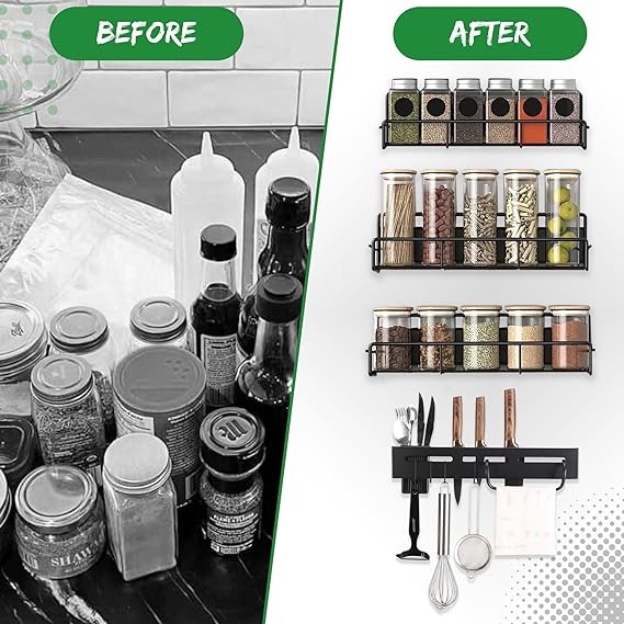 Spice Rack: Magnetic Spice Rack is Super Sturdy Magnetic, Metal, Water Proof, Rust Proof, bears 7.7 pounds, different functional uses, Magnetic Shelf Can be attached to other ferrous metal surfaces, such as Refrigerator, Microwave Ovens, and Washing Machines, Coffee Machine, other metal household appliances. It's particularly Kitchen Shelf Organizer, and Seasoning bottles, Drinks, Cans, Snacks, and more. these Spice Racks will save you from an unorganized kitchen to an organized kitchen, in which your items will be close to you and also you will have more space in your kitchen and drawers for other things or to buy more products for your kitchen.