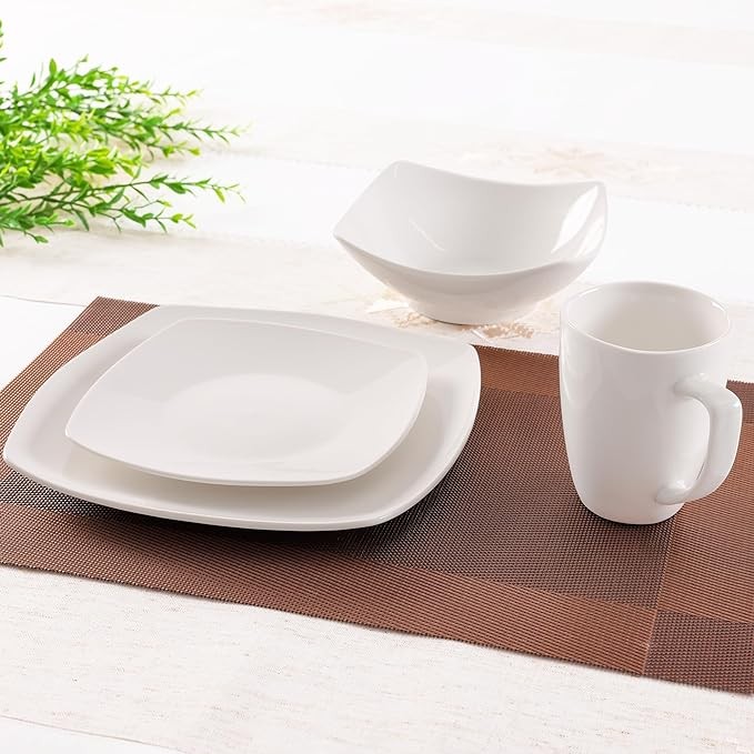 • HIGH-QUALITY PORCELAIN: This sophisticated, premium-quality white dish set has the right balance of weight and size, making family mealtimes extraordinary for years to come. Our square dinnerware set is microwave and oven safe, making cooking simple and quick. Note: Handle with care, as the plates and bowls can get hot when placed in the microwave.