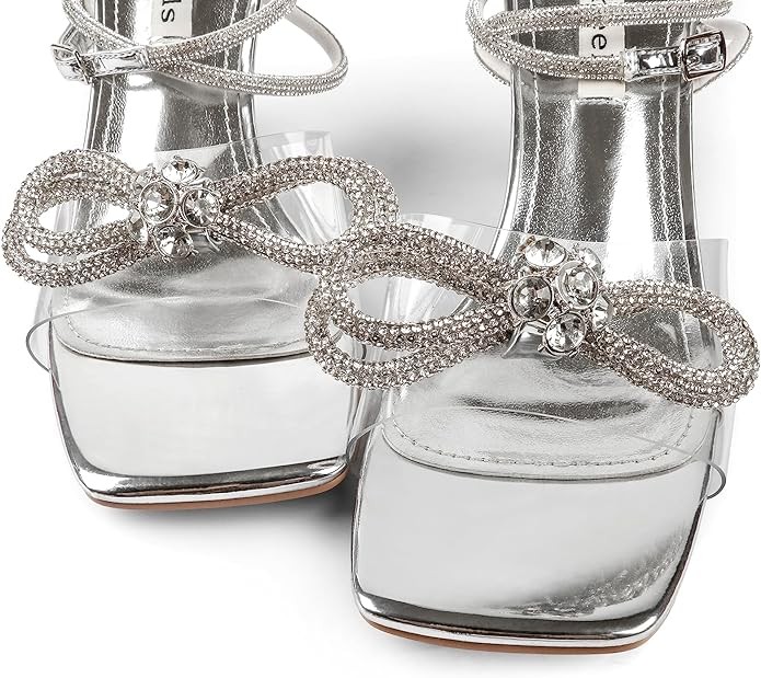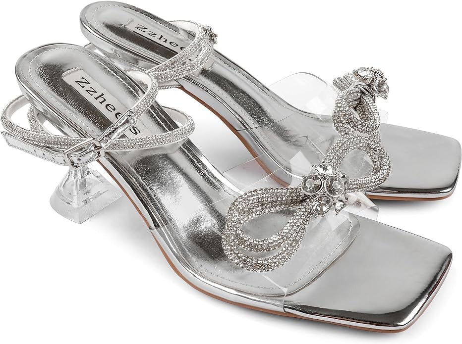 Zzheels Double Bowknots Crystal Sandals Clear Slingback Heels Square Toe Shoes for Party Wedding